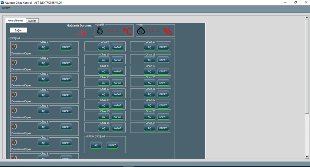 İnternet cihaz kontrol sistemi Akıllı mobil cihazınız ve ya bilgisayar ile 8, 16, 24 adet röleli alıcı üniteye bağlı cihazların kontrolünü yapabilirsiniz. Genişleyen röle modülleri ile daha fazla cihazı kontrol etme imkanı sağlar. Bu şekilde merkezi üniteye uzak mesafedeki cihazların, kontrol edilmesi kolay hale gelir. Sistem lokal ağda modeme yönlendirilerek, internete ihtiyaç duymadan çalışır.